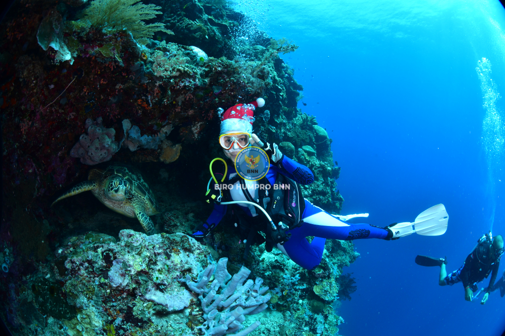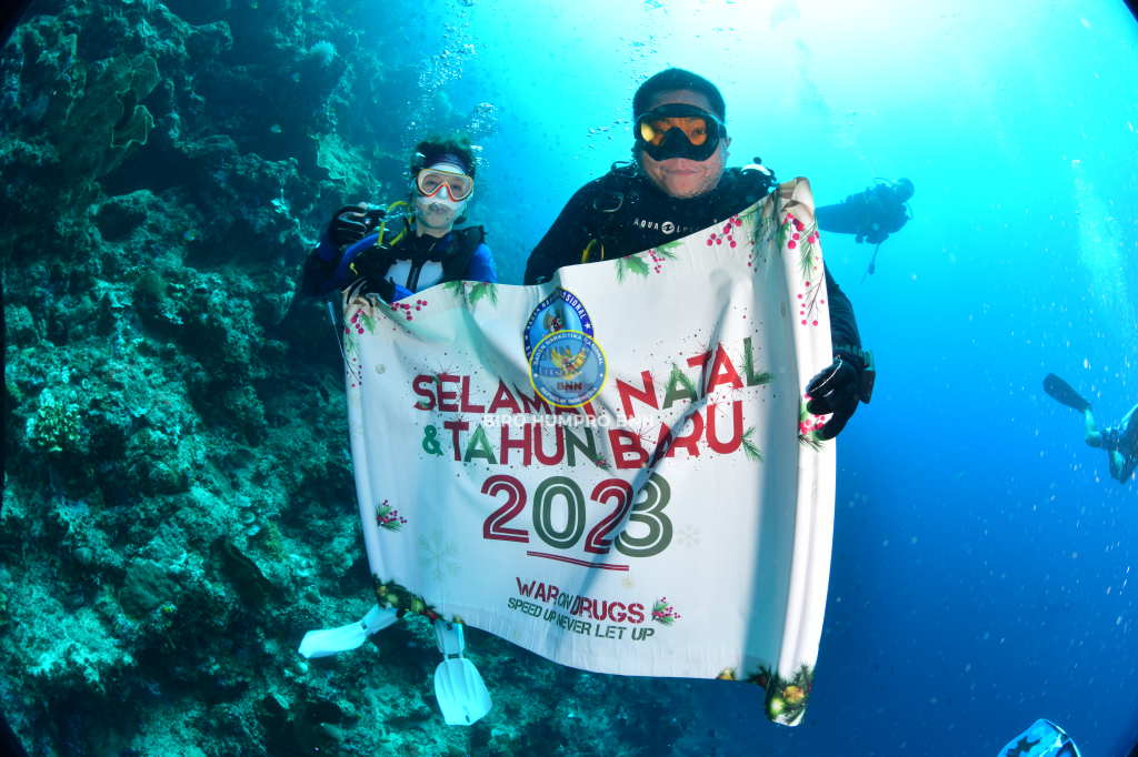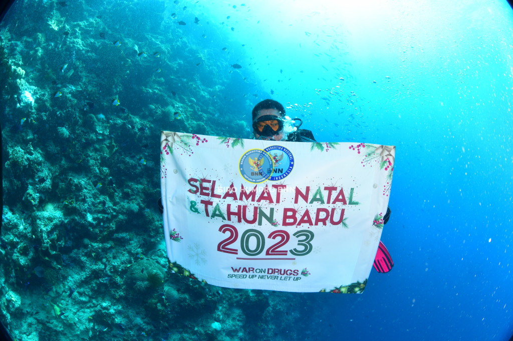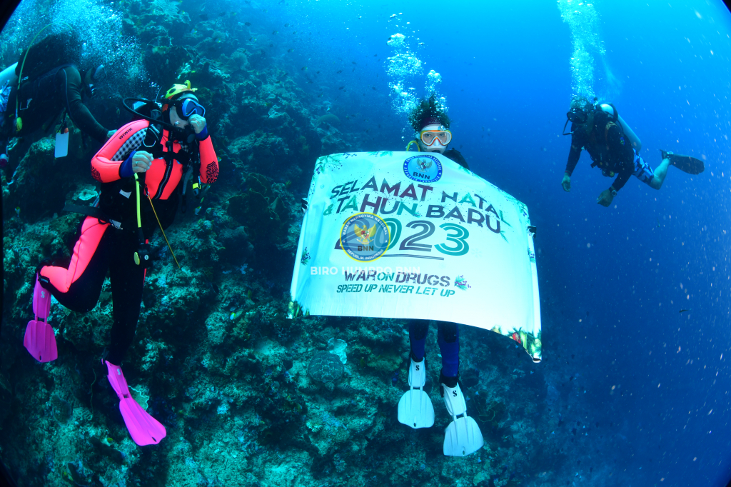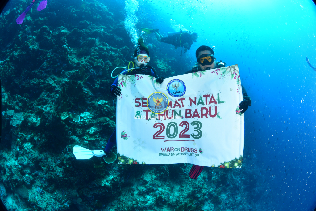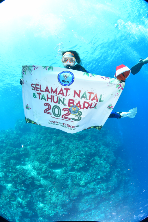 Kepala Badan Narkotika Nasional Republik Indonesia, Dr. Reinhard Golose dan Ibu Barbara Golose, lengkap dengan pernak-pernik Natal mengucapkan selamat Natal dan Tahun Baru 2023 dari bawah laut Manado. Bertempat di Taman Laut Bunaken, Manado Sulawesi Utara, Jumat (16/12). Selain memperlihatkan alam bawah laut yang begitu indah juga untuk menunjukkan bahwa olahraga diving merupakan suatu kegiatan olahraga air yang positif untuk dilakukan oleh semua kalangan. Seperti kita ketahui bahwa olahraga menjadi salah satu cara terbaik untuk mencegah masyarakat dari penyalahgunaan narkoba. Kepala BNN RI, Dr. Petrus Reinhard Golose menyampaikan harapannya, dengan makna Natal, di samping membawa terang juga meminimalisir penyalahgunaan dan peredaran narkotika di Indonesia dengan semangat War On Drugs menuju Indonesia Bersinar (Bersih Narkoba). Biro Humas dan Protokol BNN RI
