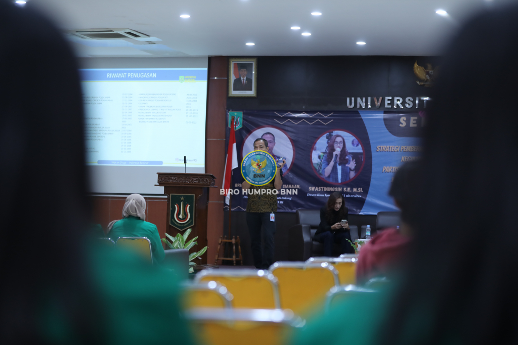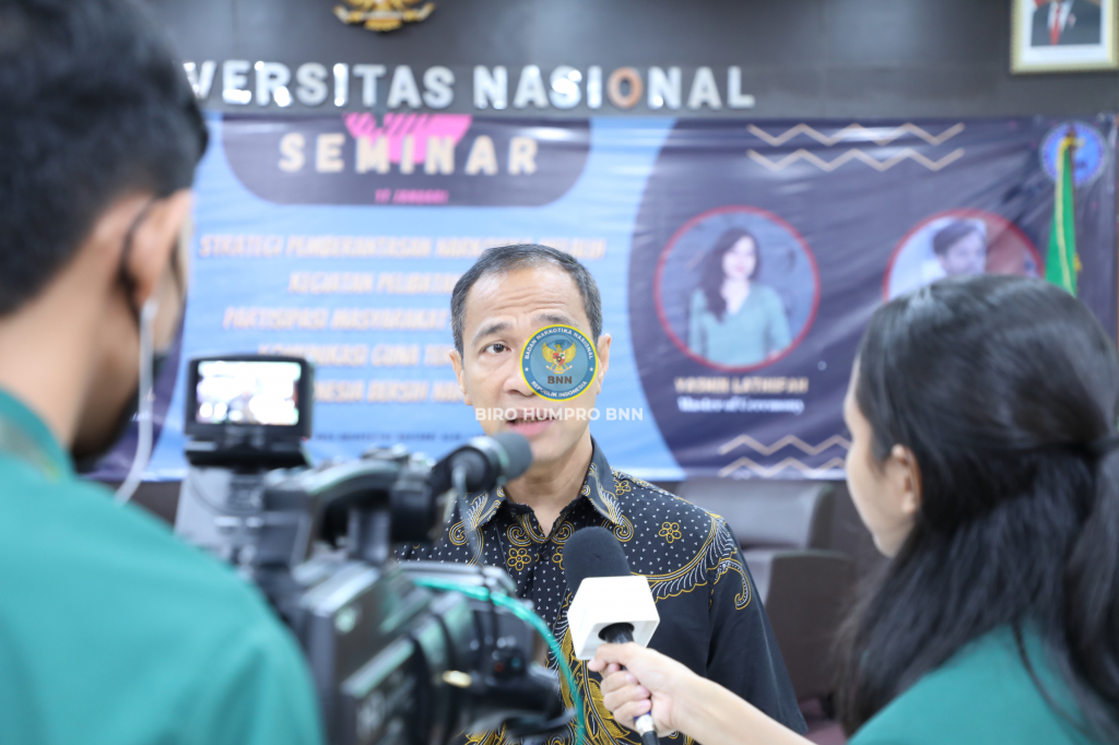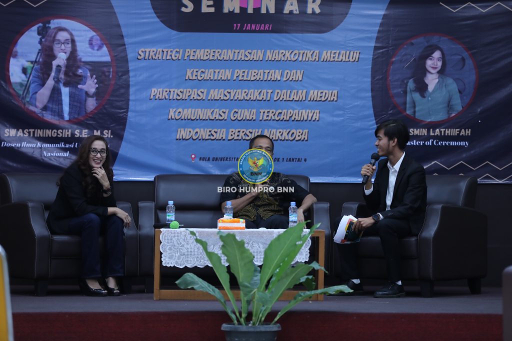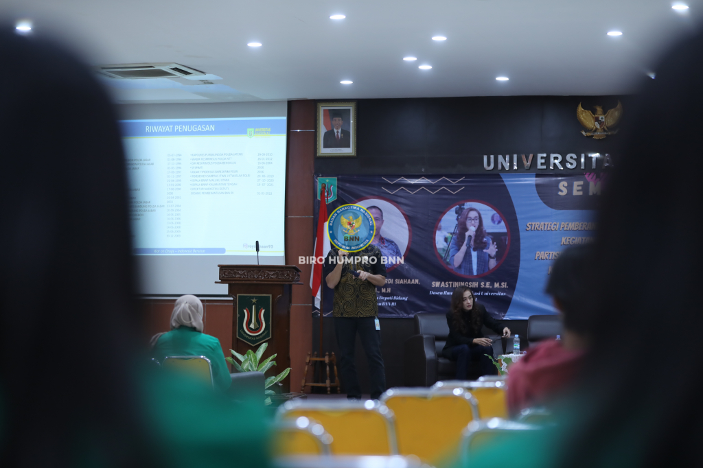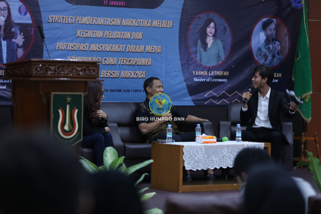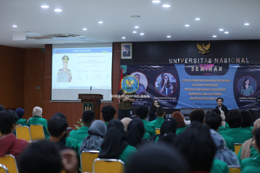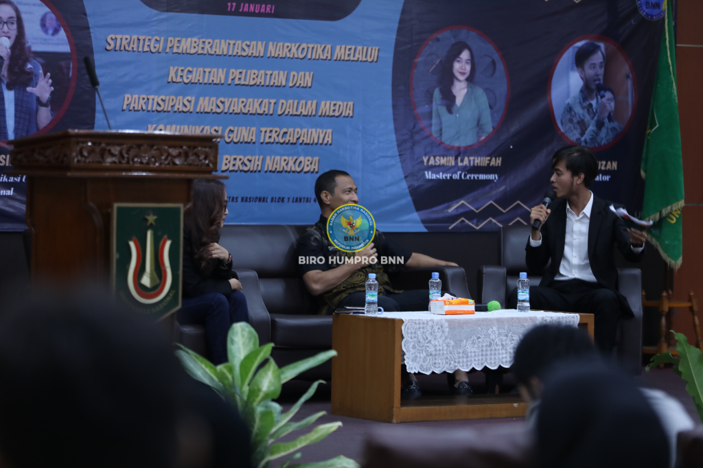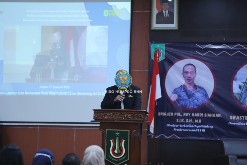 Direktur Narkotika BNN RI berikan materi pada Sosialisasi Bahaya Penyalahgunaan Narkotika dihadapan para mahasiswa/i Fakultas Ilmu Komunikasi Universitas Nasional Jakarta. Selasa (17/1).