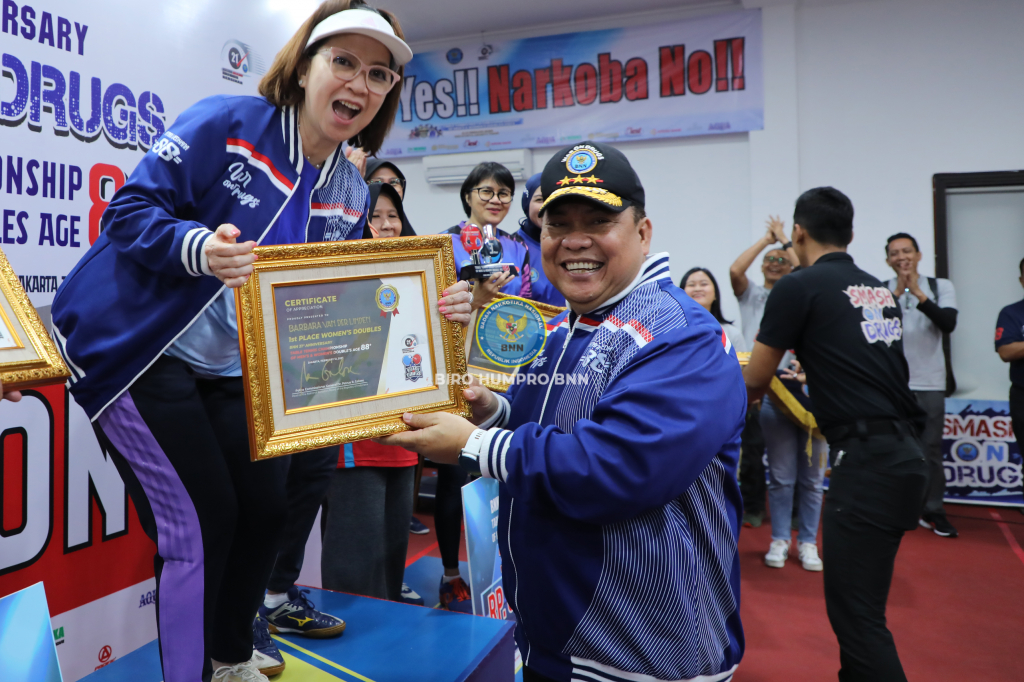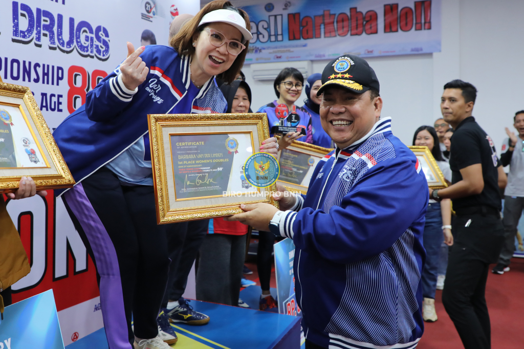 TUTUP GELARAN SOD 88+ KEPALA BNN RI : UMUR BUKAN HALANGAN UNTUK BERPRESTASI Jakarta, 12 Februari 2023 Pertandingan tenis meja dalam rangka jelang hari ulang tahun Badan Narkotika Nasional Republik Indonesia (BNN RI) ke-21, ”Smash On Drugs Table Tennis Invitation Championship of Men’s and Women’s Doubles 88+ 2023”, yang digelar di Gedung Ahmad Dahlan – BNN RI, Cawang, Jakarta Timur, secara resmi ditutup oleh Kepala BNN RI, Dr. Petrus Reinhard Golose, pada Minggu (12/2). Selain dihadiri oleh Pejabat Tinggi Madya dan Pratama di lingkungan BNN RI serta Penasihat dan Pengurus Dharma Wanita Persatuan (DWP) BNN RI, upacara penutupan kejuaraan tenis meja tersebut juga dihadiri oleh Menteri Pemberdayaan Perempuan dan Perlindungan Anak, I Gusti Ayu Bintang Darmawati, S.E., M.Si, hingga komedian Abdel Achrian yang dikenal gemar bermain pingpong. Pada kejuaraan yang melibatkan 112 peserta, terdiri dari 8 pasang Ganda Putri dan 48 pasang Ganda Putra ini, pasangan Ibu Barbara Van Der Linden Golose yang berpasangan dengan Christine (BNN RI) berhasil meraih gelar juara pertama pada kategori Ganda Putri dengan skor 3 - 1. Sedangkan gelar juara pada kategori Ganda Putra berhasil diraih oleh pasangan Saiful dan Saifur (STEDI) dengan perolehan skor 3 - 0. Dalam sambutannya pada upacara penutupan Smash on Drugs Table Tennis Championship 88+, Kepala BNN RI mengatakan bahwa kejuaraan tenis meja yang dikhususkan bagi veteran atlet nasional tenis meja ini membuktikan bahwa usia tidak menjadi penghalang berolahraga. "Dari pertandingan yang telah berlangsung selama dua hari ini Saya melihat bahwa umur bukan masalah untuk berprestasi baik perempuan maupun laki-laki, yang penting sampaikan kepada keluarga dan lingkungan saudara-saudara untuk tidak menggunakan narkotika", ujar Kepala BNN RI. Lebih lanjut Kepala BNN RI berharap agar kejuaraan tenis meja ini menjadi ajang silaturhami bagi para veteran atlet tenis meja nasional dengan para atlet muda yang tengah merintis prestasinya dalam olahraga yang dikenal merakyat tersebut. "Terlepas dari kalah ataupun menang, Saya berharap kejuaraan tenis meja ini tetap menjadi media untuk Kita mempererat tali silaturahmi", ujar Kepala BNN RI dalam sambutannya pada upacara penutupan. Pada akhir sambutannya, Kepala BNN RI menutup dengan sebuah pantun : Dua pulau terpisah selat Pantainya lebar banyak nelayan Smash on Drugs buat kita sehat Kampanye anti narkotika terus gelorakan #smashondrugs #warondrugs #speedupneverletup #accelerationforwarondrugs BIRO HUMAS DAN PROTOKOL BNN RI