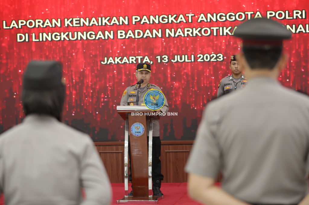 Sekretaris Utama Badan Narkotika Nasional Republik Indonesia, Tantan Sulistyana, S.H., S.I.K., M.M., memimpin langsung Upacara Korps Raport Kenaikan Pangkat Anggota Polri penugasan di lingkungan BNN, bertempat di Ruang Rapat Muhammad Hatta Gedung Tan Satrisna BNN, Kamis (13/7).