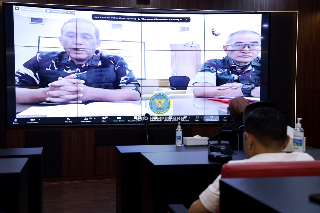 Deputi Rehabilitasi, Dra. Riza Sarasvita, M.Si., MHS., Ph.D., memimpin rapat dengan Rindam TNI melalui daring di Ruang Hoegeng BNN, Jumat (22/9).