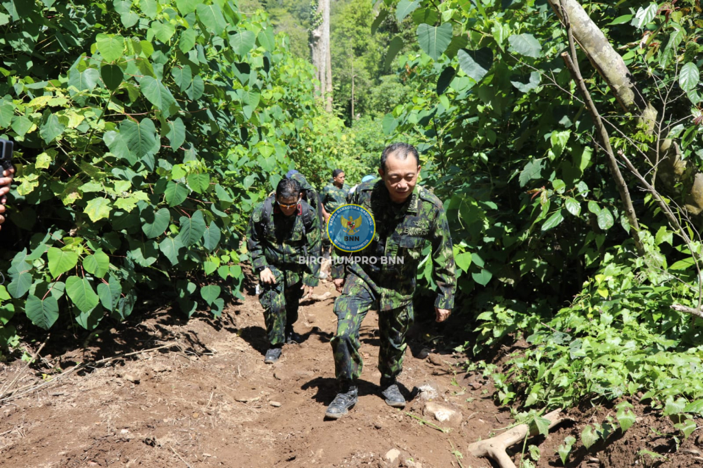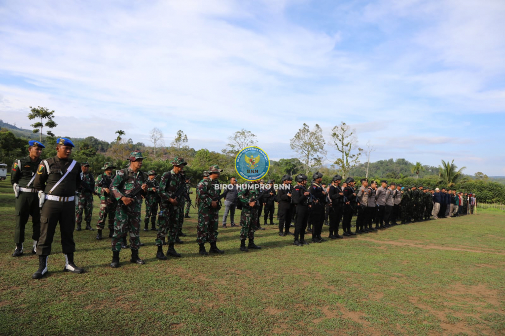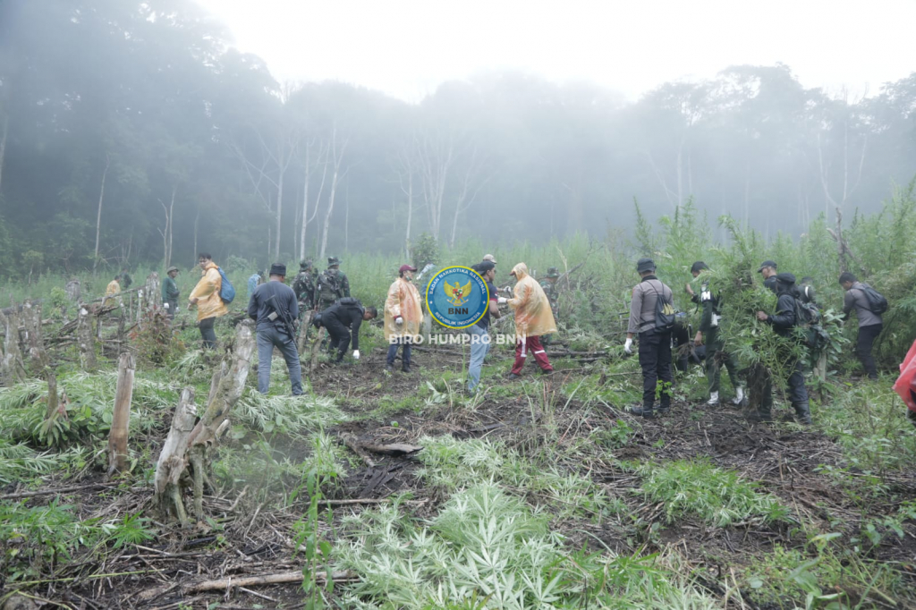 Badan Narkotika Nasional (BNN) Republik Indonesia melakukan pemusnahan ladang ganja seluas 1 Hektar pada ketinggian 1.300 MDPL di Desa Pulo, Kecamatan Seulimeum, Kabupaten Aceh Besar, Senin (2/10). Lima belas ribu (15.000) tanaman ganja seberat 7,5 ton dengan tinggi berkisar antara 20 hingga 350 cm dan kerapatan tanaman 50 cm dimusnahkan oleh 147 personel yang terdiri dari BNN Pusat, BNNP Aceh, Polri, TNI, Satpol PP, Kejaksaan Tinggi, Dinas Kehutanan, Dinas Pertanian dan Bea Cukai.