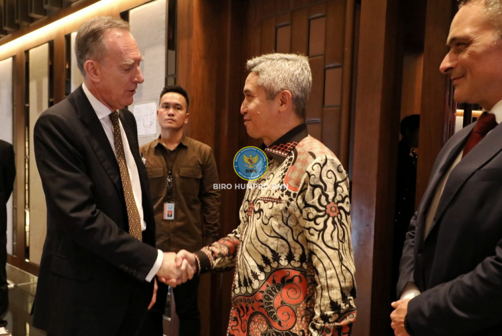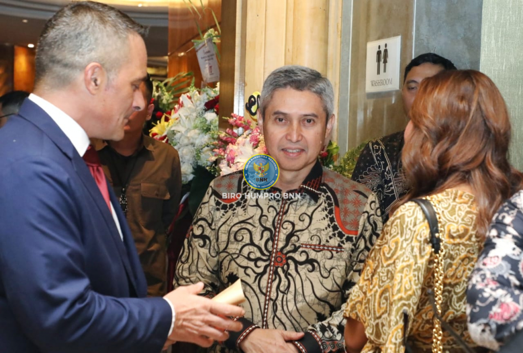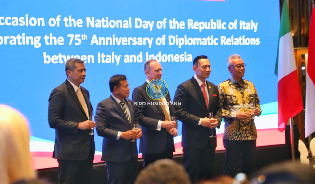 Sekretaris Utama BNN RI Tantan Sulistyana, S.H., S.I.K., M.M., di dampingi Direktur Kerja Sama Deputi Bidang Hukum dan Kerja Sama, Dr. R.M. Aria T.M. Wibisono menghadiri Hari Nasional Republik Italia dan merayakan HUT ke-75 Hubungan Diplomatik Antara Italia dan Indonesia, di Jakarta (7/6).